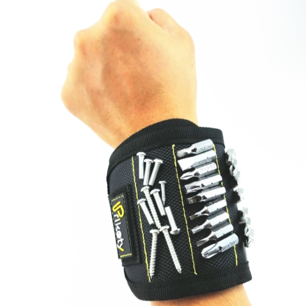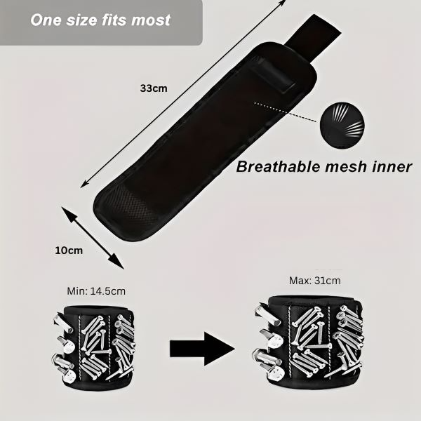 Die starken Magnete in diesem Armband lassen sich leicht um das Handgelenk wickeln und halten kleine Metallgegenstände wie Schrauben, Nägel und Bolzen griffbereit.